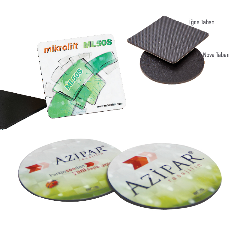 8,75 x 8,75 cm Kare veya 8,8 x 8,8 cm yuvarlak / 2.8 mm nova yada, 2.6 mm iğne desen taban / 4 renk baskı, PVC kaplama