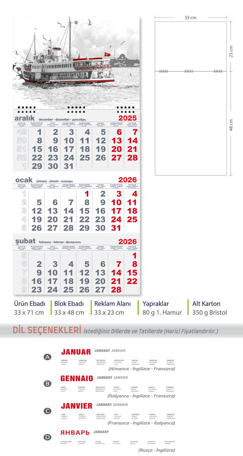 Beş Aylık Gemici Takvim (Üç Parça Spiralli)