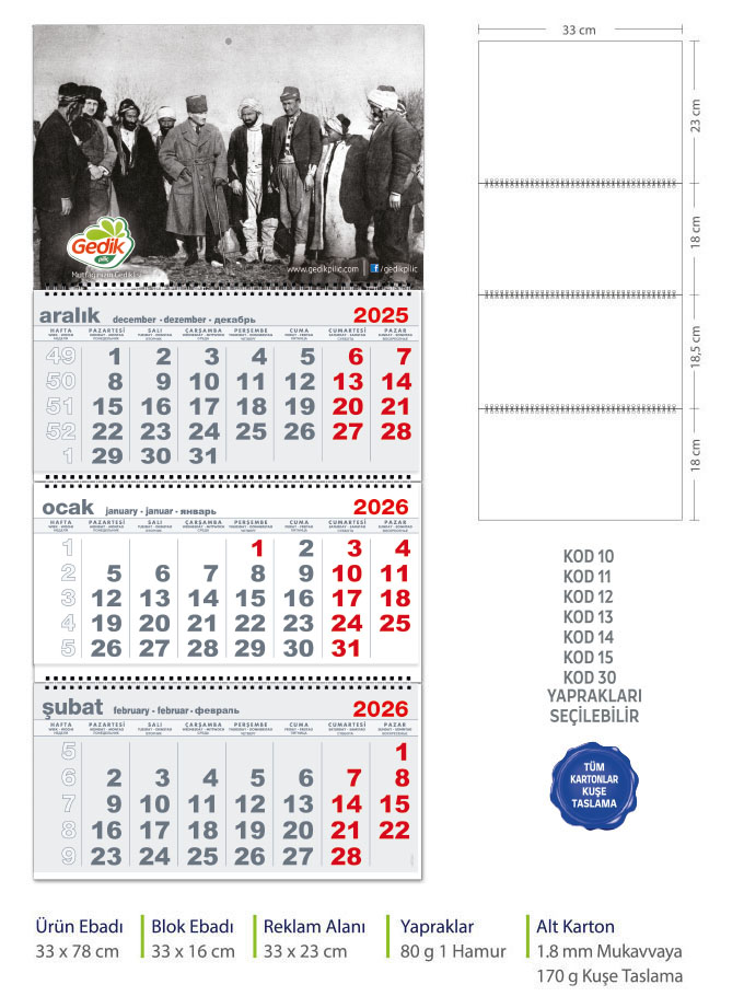 Atatürk Gemici Takvim (Üç Parça Spiralli)