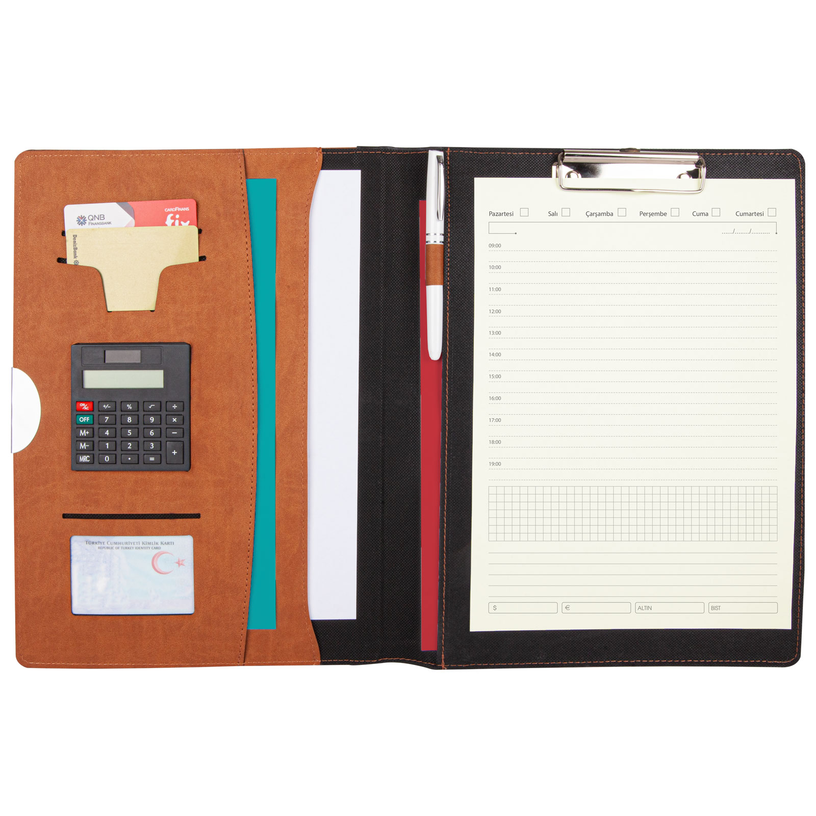 *25 x 34,5 cm *Termo Deri Kapak *Yuvarlak Köşe *Mekanizmalı *İç Blok *A4 *Hesap Makinesi *Baskı: Sıcak, UV, Serigrafi, Lazer